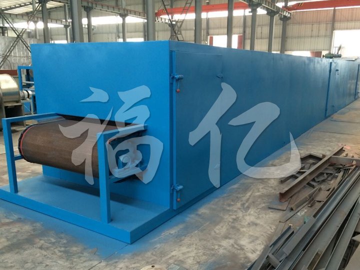 物料由加料器均勻地鋪在網帶上,網帶一般采用12-60目不銹鋼絲網,由傳動裝置拖動在干燥機內移動。干燥機由若干單元組成,每一單元熱風獨立循環,部分尾氣由專門排濕風機排出,廢氣由調節閥控制,熱氣由下往上或由上往下穿過鋪滿物料的網帶完成熱量與質量傳遞的進程,帶走物料水份。網帶緩慢移動,運行速度可根據物料溫度自由調節,干燥后的成品連續落入收料器中。上下循環單元根據用戶需要可靈活配備,單元數量亦可根據需要選取。