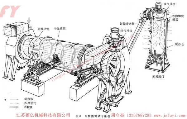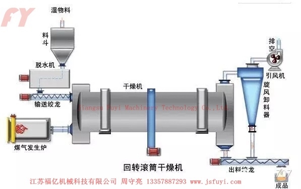 濕物料從干燥機(jī)一端投入后,在內(nèi)筒均布的抄板器翻動(dòng)下,物料在干燥器內(nèi)均勻分布與分散,并與并流(逆流)的熱空氣充分接觸,加快了干燥傳熱,傳至推動(dòng)力。在干燥過(guò)程中,物料在帶有傾斜度的抄板和熱氣流的作用下,可調(diào)控地運(yùn)動(dòng)至干燥機(jī)另一段星形卸料閥排出成品。