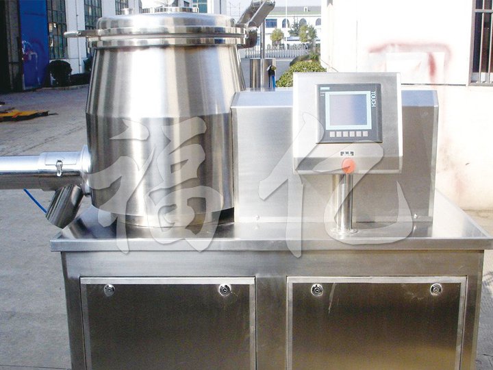 粉體物料與粘合劑在圓筒形容器中由底部混合漿充分混合成濕潤軟材,然后由側置的高速粉碎槳切割成均勻的濕顆粒。