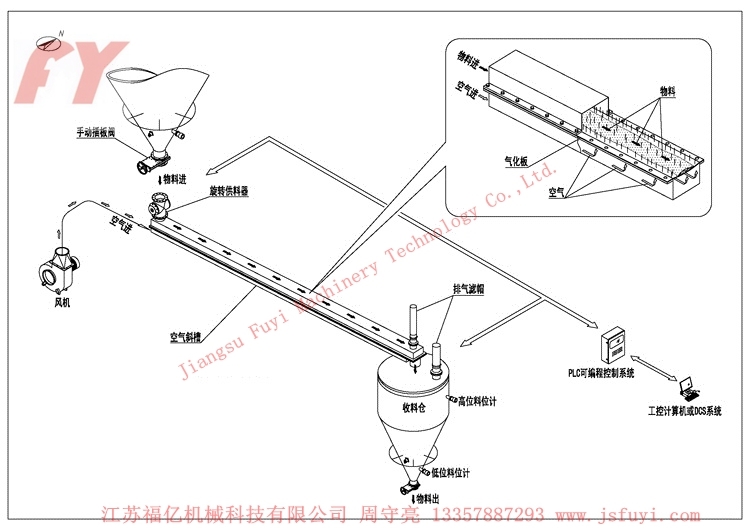 1. 物料在有透氣層斜槽上面隨氣流下滑以實現(xiàn)輸送;